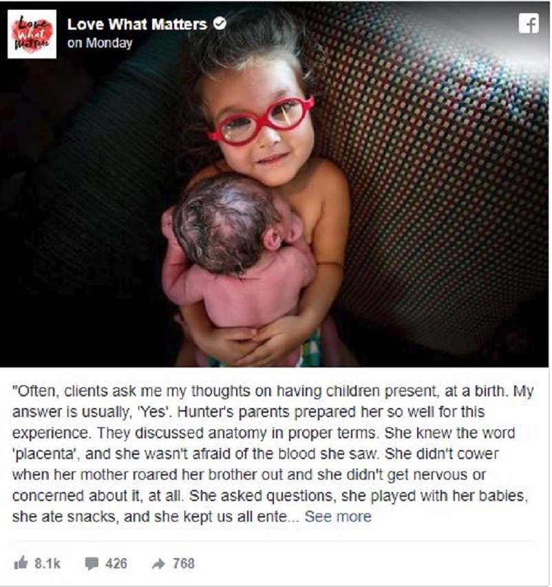Love What Matters/facebook “Birth is such a natural part of life and such an awesome moment, especially for a brother or sister to be there when their sibling is born; it really makes such an awesome connection for them for the rest of their lives.
